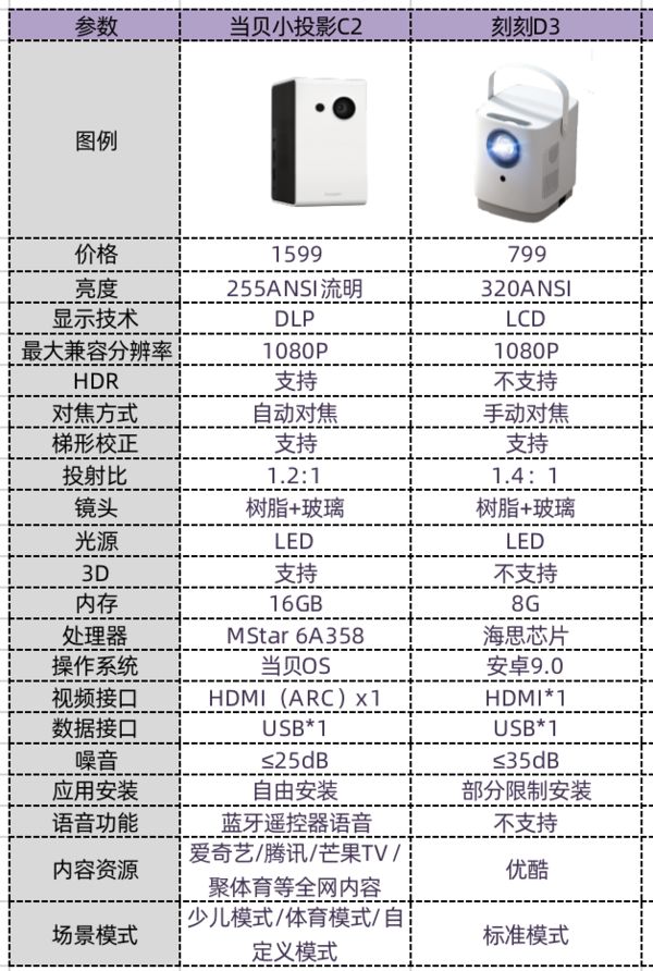 从参数表来看,当贝C2的售价要比刻刻D3贵一倍不到,亮度也比当贝C2高一些。但是仔细比较来说,小编还是觉得当贝C2更具性价比。现在就来看看为什么说当贝C2更具性价比。
