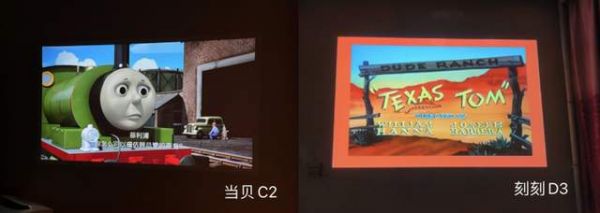 让我们来看看画质上的对比,从对比图来看,当贝C2的画面更清晰更亮,画面也比较纯净鲜艳。同时在刻刻D3上同时也出现了画面发白的现象。