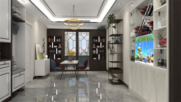 动静分区的餐厅,呈现不同瓷砖规格效果图。