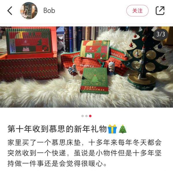 其中一位连续10年收到慕思圣诞礼物的粉丝表示,每年冬天都会突然收到一个快递,十多年坚持做一件事情还是会觉得很暖心。