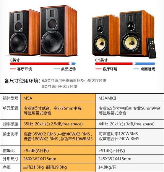 惠威M系列三分频高保真有源音箱一直是发烧友心中音质与外观兼得的产品,作为惠威有源音箱的当家花旦,M5A是客厅电视伴音一步到位之选。从M3到M3A,惠威以出色的设计理念,专业的电声技术,为不少朋友带来出色的音质体验。对于很多想要购买有源音箱的用户来说,这是一个很不错的选择。