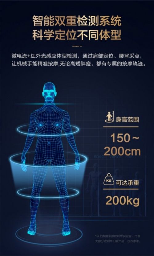 第一波是重力感应定位,是根据用户体重、身体给按摩椅带来的压力来判断,算是以面定位,可以大致判断出用户身高、体型,但穴位还不够精准。
