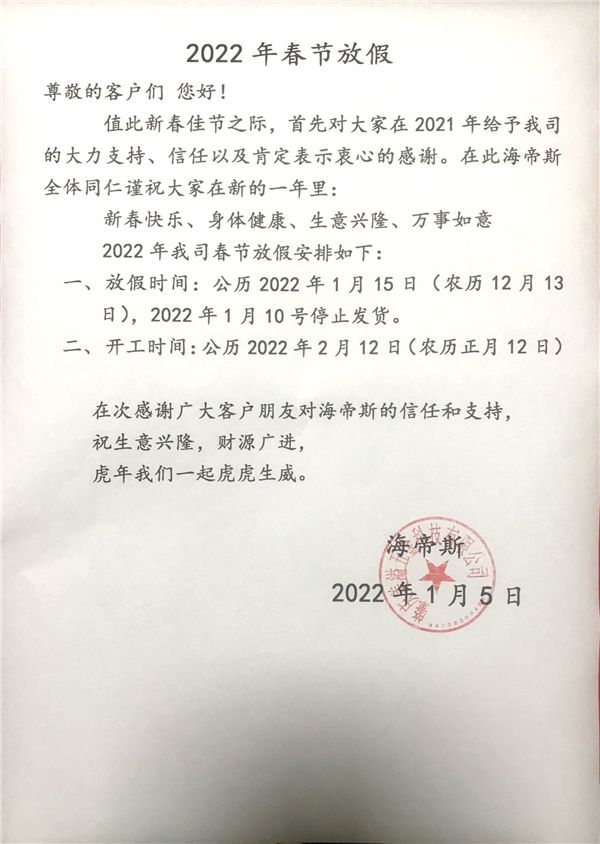 门窗快讯|海蒂斯五金公布2022年春节放假安排