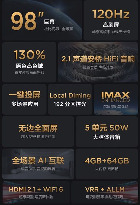 TCL 98Q6E IMAX Enhanced巨幕智屏还同时具备了HDMI 2.1、安桥音响、腾讯云游戏认证等配置,支持杜比视界和杜比全景声。此外,得益于顶级的音画质,TCL 98Q6E IMAX Enhanced巨幕智屏取得了 IMAX Enhanced专业认证,获得IMAX Enhanced认证之器材必须符合IMAX、DTS工程师及好莱坞知名技术专家制订的“最高级影像与音效标准”,门槛相当之高,其大屏音画效果可以让我们在家轻松享受IMAX级的试听感受。