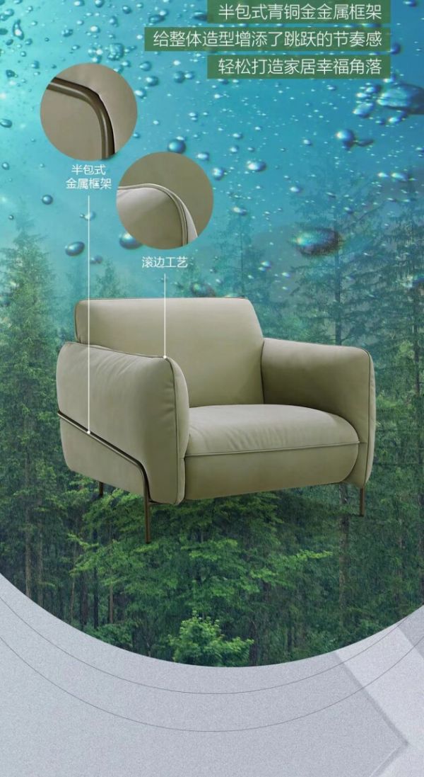 靠包造型简约,方正大气,轮廓滚边细致,圆润分明,整体方圆有度。半包式青铜金金属框架前后错落,形成坡度,增添了跳跃的节奏感,赋予了空间一种都市生活的精致和年轻调性,在品质之上打造出个性时髦的气质。