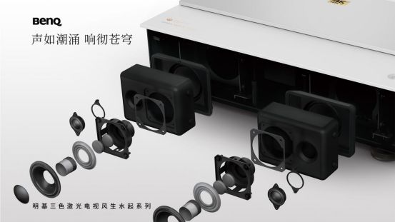 与足以媲美专业影院的杰出音画相匹配,明基产品开发团队在外形和内部构造设计上,也希望呈现出“音色和鸣”的观感。团队继承发扬了BenQ一贯“东体西形两元相融”的设计哲学,从自然汲取灵感,萃取“风”与“水”两大自然意向元素,凝结为“风可见,水无形”的设计理念,最后通过西方的设计方式进行表达,使产品文化内涵与现代感并存。