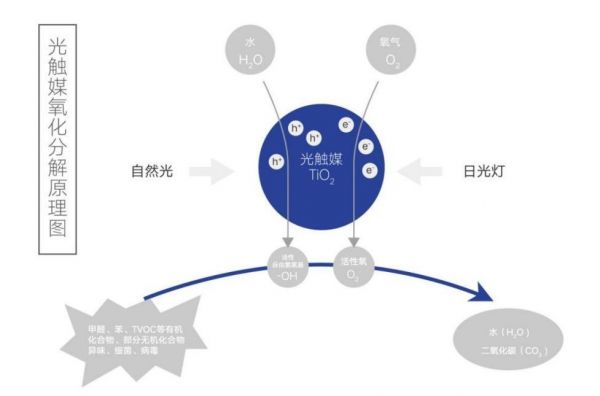 树派环保引进日本光触媒产品及技术,树派环保所采用光触媒的主要成分是改性锐钛型纳米二氧化钛(TiO2),当光触媒喷到基材表面时,渗透进基材0.06微米会形成一层薄膜。光触媒在光的照射下,会产生类似光合作用的光催化反应,产生出氧化能力极强的自由氢氧基和活性氧,具有很强的光氧化还原功能,可氧化分解各种有机化合物和部分无机物。当甲醛释放出来的时候,与自由氢氧基和活性氧产生氧化反应,将甲醛、苯、TVOC等化学性物质分解成二氧化碳和水 。