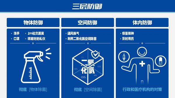所谓三层防御,是指空间防御、物体防御和体内防御。物体防御是指对物体表面的消毒杀菌;体内防御是指通过增强人体自身机能来实现对细菌病毒的免疫。而常常被忽略的空间防御,则是作用于整个空间环境,通过切断病菌的传播途径,从源头上实现疾病预防,全方位呵护人体健康。