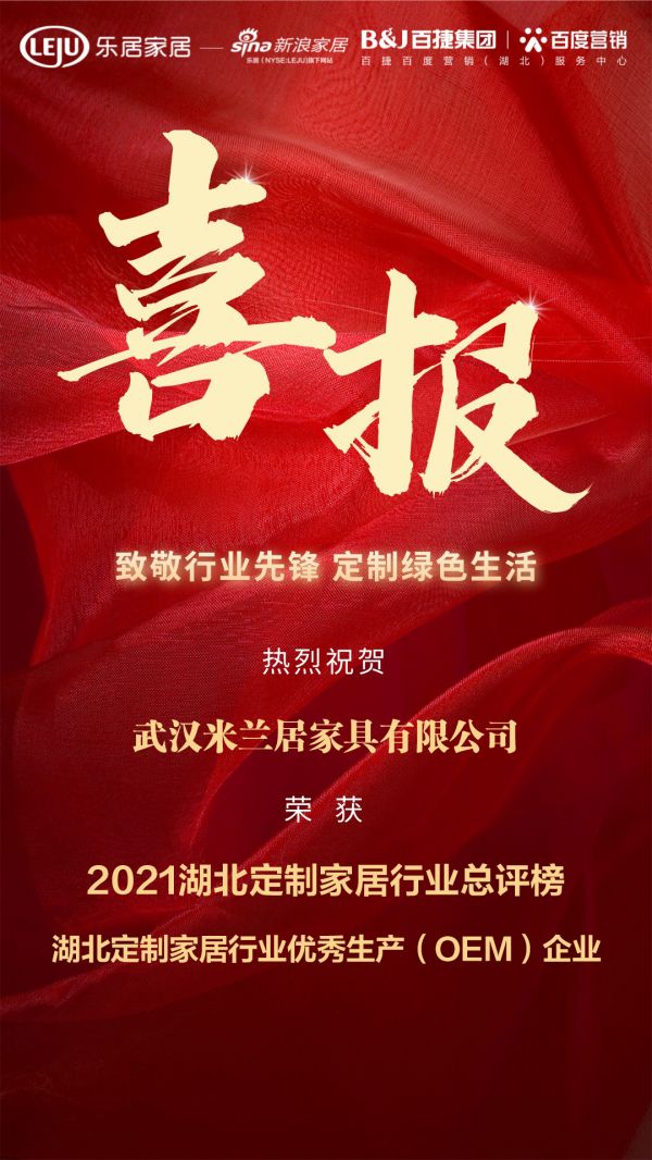 喜报|武汉米兰居家具荣获20212021湖北定制家居行业优秀生产(OEM)企业