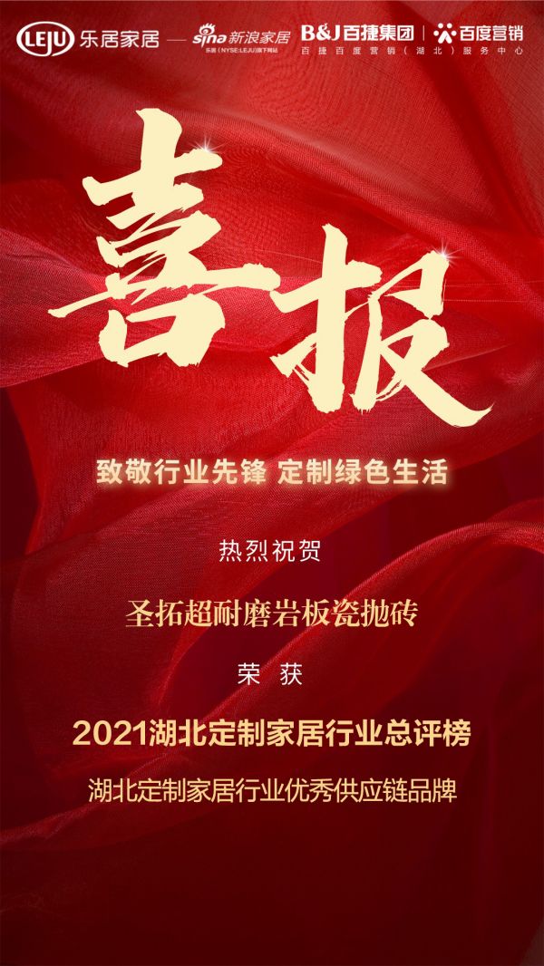 喜报| 圣拓超耐磨岩板瓷抛砖荣获2021湖北定制家居行业优秀供应链品牌