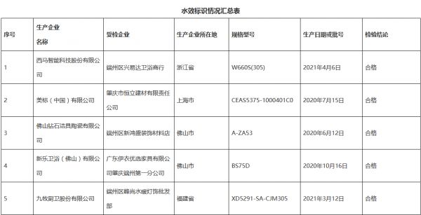 近日,广东省市场监督管理局网站公布2021年水效标识计量监督抽查结果。本次专项监督抽查对象为流通领域已获得“中国水效标识”备案的智能坐便器。承检单位为广东省潮州市质量计量监督检测所。本次共抽查30家企业30个型号的智能坐便器样品,经检验,全部合格。