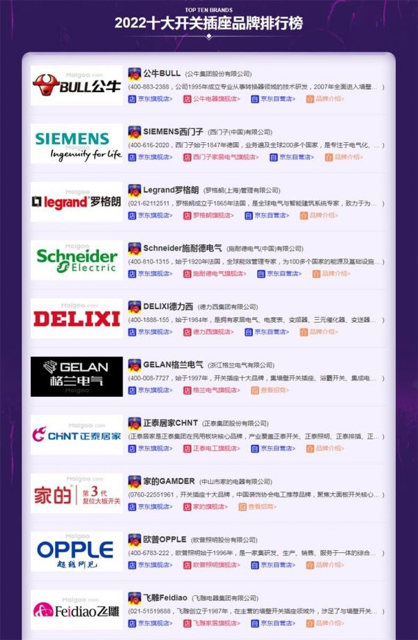 2022年开关插座行业十大品牌:公牛、西门子、罗格朗、施耐德、正泰、德力西、家的、欧普、飞雕、格兰。(排序不分先后)