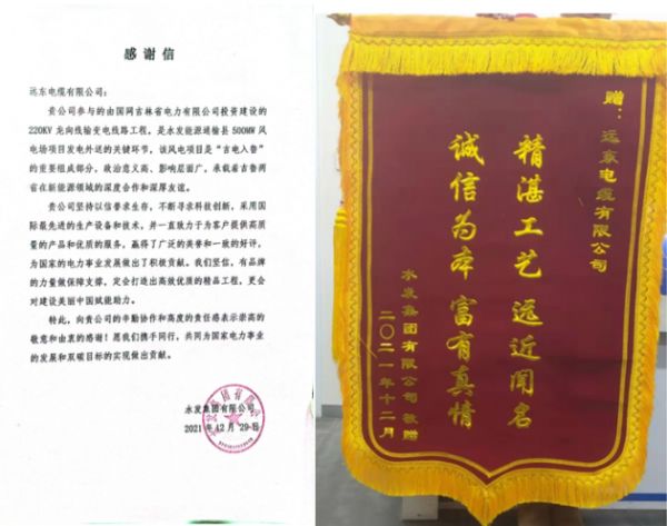 不久前,远东股份旗下另一家企业——远东电缆有限公司也收到了一封来自于重要客户水发集团有限公司的感谢信和锦旗,对远东电缆的辛勤协作和高度的责任感表示感谢,高度肯定了远东电缆为220KV龙向线输变电线路工程建设所做的重要贡献,为项目提供了高质量的产品和优质的服务。