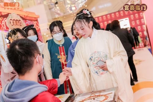 红包墙打卡区中央有一个大大的“囍”字,流露着浓浓的甜蜜婚嫁氛围。此外,现场还邀请专业团队进行国风舞蹈秀、国风音乐等精彩表演活动,展现国潮魅力,为顾客带来一场绝佳的视觉盛宴。