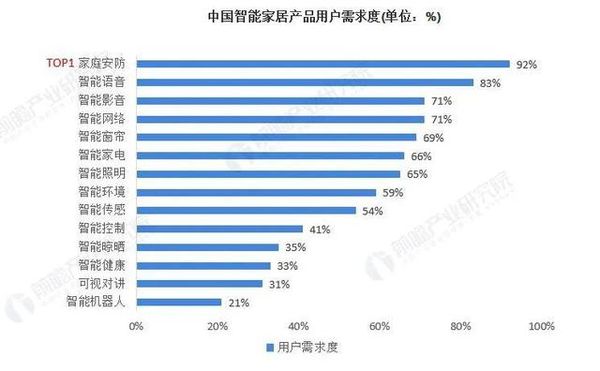 从中国智能家居产品用户需求度情况来看,家庭安防是用户需求度最高的智能家居产品,需求度高达92%。从设备供应市场占比来看,家庭安防也是当前智能家居品类中市场份额最大的设备类别,市场份额排名第一,占比为21%。家庭安防已成智能家居消费刚需,深受消费者喜爱。指纹识别远程控制等人工智能等技术的快速崛起给人们生活带来巨变。