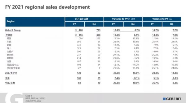 日前,吉博力公布了2021年营收情况,实现了自1999年上市以来最强劲的销售增长。尽管供应链上出现了相当大的挑战,由于正面的基数效应和疫情封锁反弹带来的装修热潮,以及房地产拉动。与2020年相比,净销售额增长15.9%,达到34.6亿瑞士法郎(合人民币241.5亿元)。与2019年相比,增长16.7%。预计2021年息税折旧摊销前利润率约为31%。