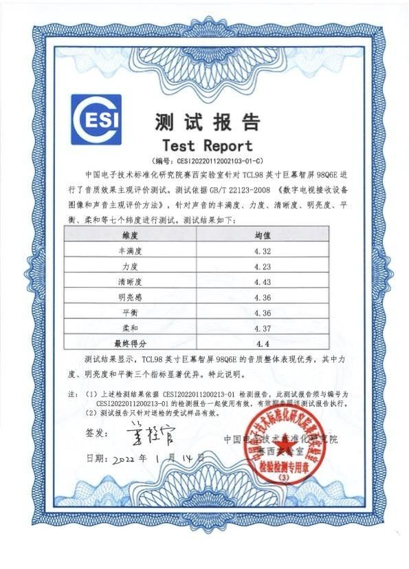一台电视的画质好与坏,我们从视觉上就能直观感受到,但对于电视的音质,我想绝大多数跟我一样的门外汉都听不出个所以然,但对于音乐人、调音师、音域专家、科技达人这一类精通此道的专业人士来说,电视音质的优劣其实一听就明白。所以为了寻找真正的“好声音”,国家权威级检测机构-中国电子技术标准化研究院(以下简称电子标准院)在近日受委托开展了基于TCL98英寸巨幕智屏系列产品音质效果的真实评测,并给出了极具权威且有含金量的答案。