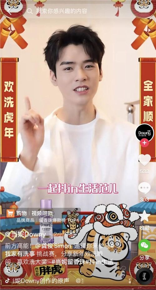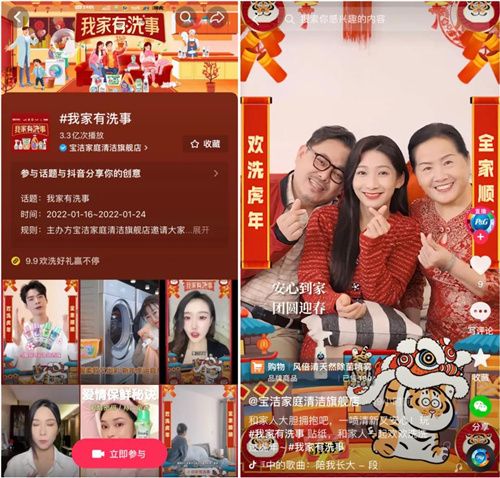 在本次活动中,“抖in生活范儿”携手宝洁一起策划推出了#我家有“洗”事 短视频挑战赛,邀请用户参与分享新年回乡、大扫除、做清洁等欢“洗”瞬间。同时,该挑战赛还联动新年热门IP“胖虎”,上线了抖音贴纸特效,与虎年春节的热点巧妙融合,进一步增强了活动趣味性,有力激发了用户参与的热情。至活动结束,#我家有“洗”事话题累计获得3.3亿次播放,共计4万余人参与该挑战赛。