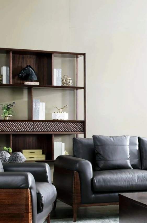 迪恩沙发深邃色调和条理清晰的木纹,融合在同色系的高端定制中,特别的感染力把大宅低调奢华、经典大气的非凡气质展现得淋漓尽致。