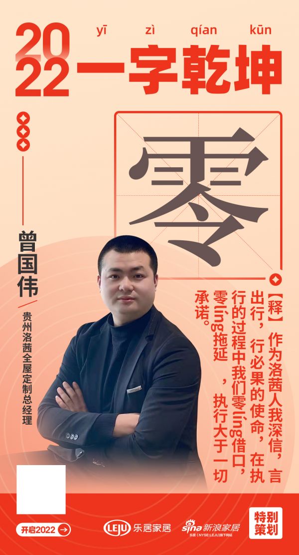 在“2022一字乾坤”活动中,贵州洛茜全屋定制总经理 曾国伟用「零」表达了2022年的规划和目标:
