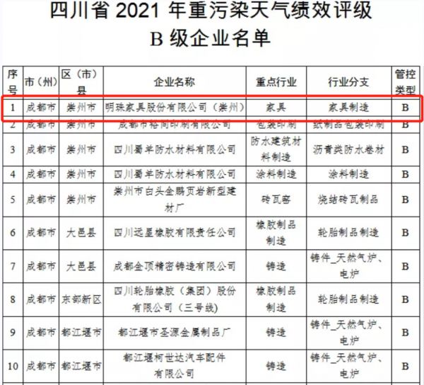 近日,生态环境厅公布2021年四川省重污染天气重点行业企业绩效评级结果,掌上明珠被认定为四川省2021年重污染天气绩效评级B级企业,在重污染天气期间可不停产限产。