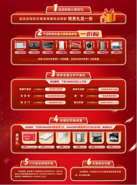 除进店好礼、全屋主材升级礼、百分百中奖金蛋礼外,安乐窝此次半价整装节让“整装”二字践行到底!活动期间下定即享最高1折购全屋大牌家具家电,最大限度满足消费者一站式整装服务的需求,拎包入住,即可开启美妙梦想!