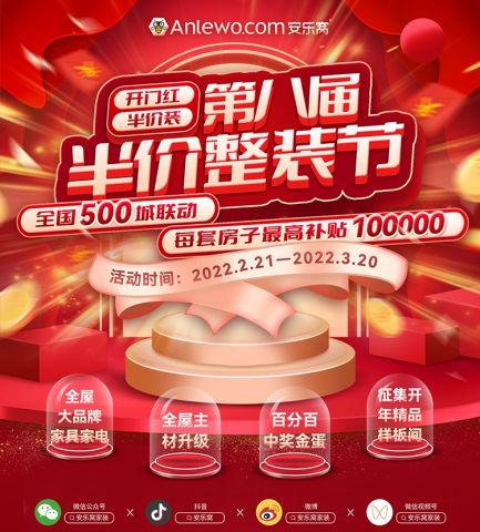 此次安乐窝第八届半价整装节在2月21日火热开启,整合了诺贝尔瓷砖、东鹏瓷砖、欧神诺瓷砖、圣象地板、大自然地板、德国贝朗卫浴、箭牌卫浴、皮阿诺定制、金牌橱柜、欧派木门等一百多个国内外一、二线建材大牌,精选超2万多款产品参与优惠活动,打响2022虎年热销开门红!