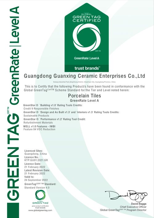 近日,冠星陶瓷企业荣获由Global Green Tag认证中心颁发的“国际绿色产品认证”证书!Global Green Tag是澳大利亚,乃至全球最大的产品可持续性认证体系之一,该认证被澳大利亚公平竞争和消费者委员会(ACCC)、美国专利商标局和绿色建筑评级部门批准的唯一认证标志。