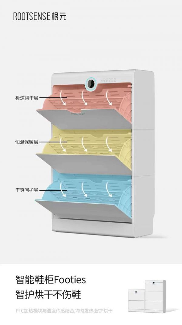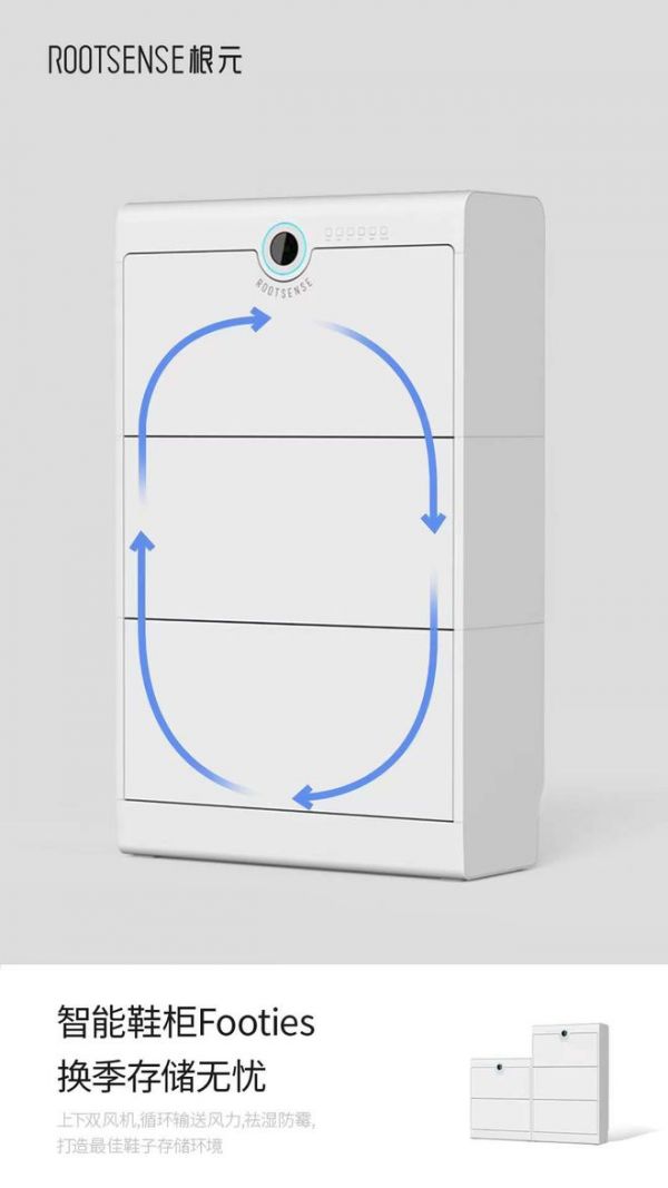 智能鞋柜Footies应用了根元科技独有的9-12SCI存护交互系统,对材质、胶水、工艺、舒适度、耐用度、空间温度、空气湿度等12个维度,选取了9个循环点位进行恒定监测控制,使得鞋子得到最佳的存储环境。