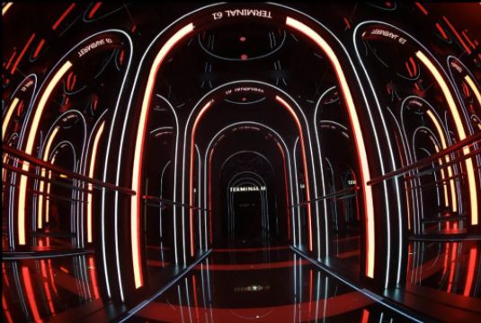 古建筑的构架上大量使用了体现现代科技的材料和灯光,在外立面的大面积透明LED屏幕,让在屏幕后面跑动的灯带隐隐约约显露出来,通场使用的灯条根据时间段变色,让东方感更具神秘性,同时对应功能至上的cyber世界中随处可见的全息影像。碰撞融合的表现形式打破了常规“传统”或“未来”给人的固定印象,并创造了独特并多重的体验感。