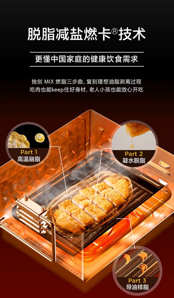 当下“三高症”呈现年轻化趋势,低油、低盐、低脂成为当代人的日常饮食所需。传统烹饪要实现低脂,存在很大技术局限,脱脂率通常不高。美的mini微蒸烤搭载了特有的“脱脂减盐”燃卡技术,减脂蒸烤功能让食物的油、盐含量大幅降低,在保留美味口感的同时,让饮食更加健康。美的独创的MIX燃脂三部曲,复刻油脂剥离过程,有效降低食物中的油脂和含盐量。以250g五花肉为例,美的mini微蒸烤可以达到16%的脱脂率,较传统烧烤提升70%以上,以国人每天约100g肉类摄入计算,使用燃脂料理烹饪则每年可以减少油脂摄入2.6L,约等于跑7个马拉松。