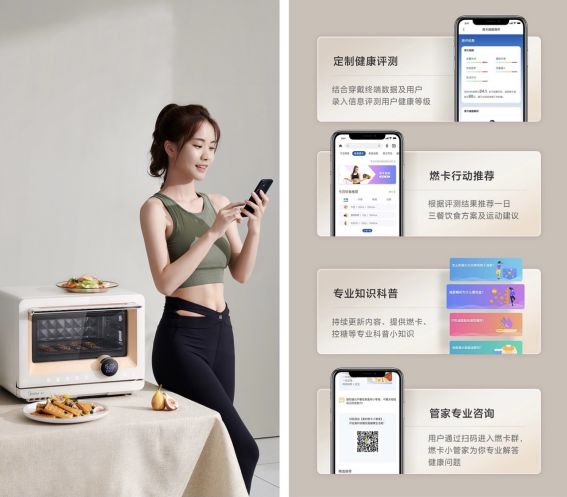 除了科学的饮食,健康生活也离不开运动。美的以用户需求为导向,打造了场景化智能健康厨房,基于美的美居为用户量身定制健康服务,结合穿戴终端数据及用户录入信息,评测用户健康等级,推荐每天的饮食方案和运动建议。用户还可以在美的美居APP的科普专栏中随时查看燃卡、控糖等专业知识,更有燃卡管家解答问题,打造全方位的健康生活一站式服务。
