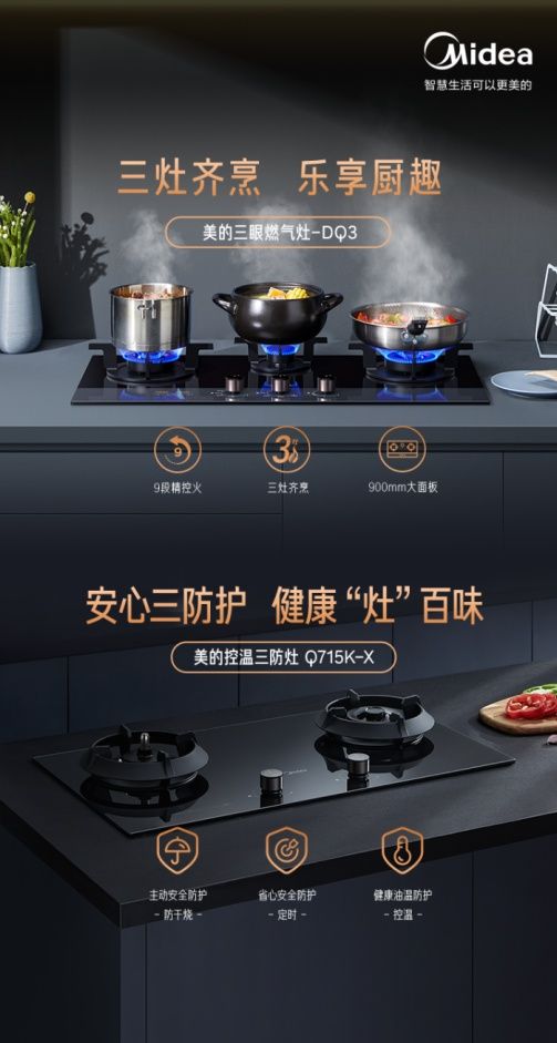此次参与活动的产品为美的控温三防灶Q715K和三眼燃气灶DQ3,两款匠心灶具将活动诚意值拉满。大多数传统灶具并没有定时定温控制,老年人健忘,年轻人工作太忙,因忘关火产生的安全隐患时有发生,而美的控温三防灶Q715K和三眼燃气灶DQ3就很好的规避了这些风险。它们甄选进口感恩探头,智能检测锅具干烧状态,高精度灵敏感知隐患,主动切断气源,时刻保障家人安全。
