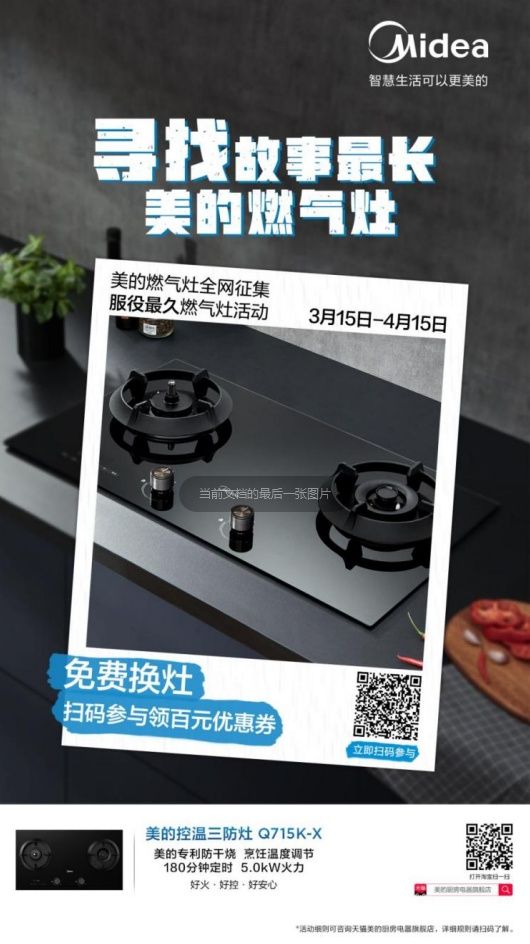 活动二:美的活动中狂送豪礼,20台灶具免费拿!使用美的燃气灶的用户均可参与“征集全网服役时间最长的美的燃气灶”活动,根据产品服役年限排名的前20名,就有机会获得美的免费换三防灶Q715K或三眼灶DQ3,其余参与活动的用户均可领取100元燃气灶换新券。