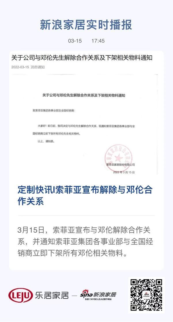 新浪定制频道讯 3月15日,索菲亚宣布与邓伦解除合作关系,并通知索菲亚集团各事业部与全国经销商立即下架所有邓伦相关物料。