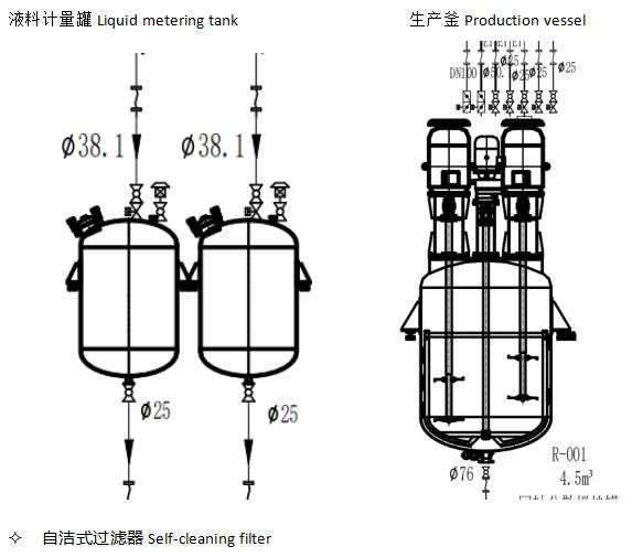 液体储罐(配有雷达液位计)经泵送至计量罐,精准称重计量后输送至生产釜,自动进料生产。