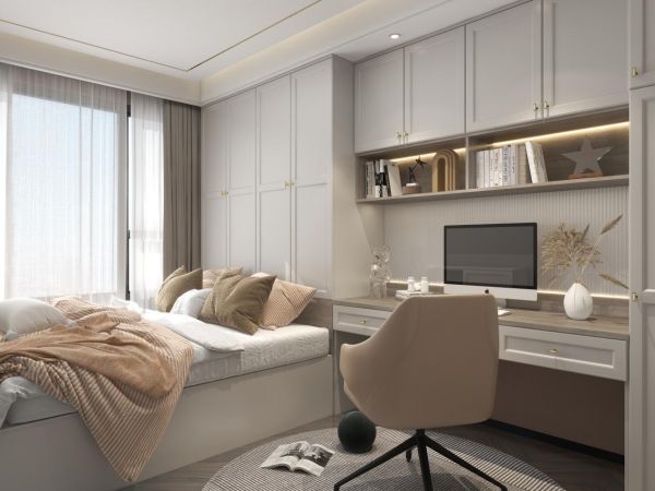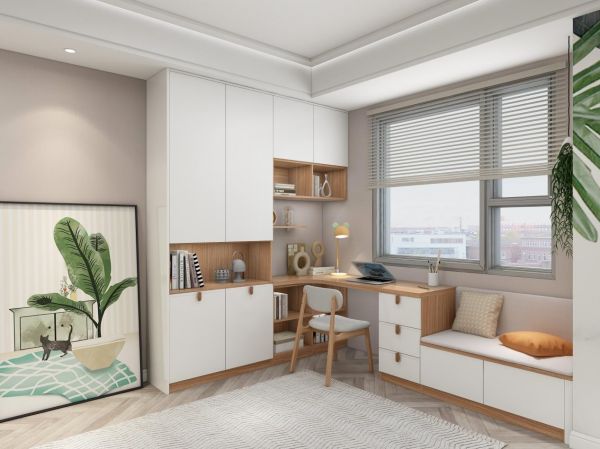 如果家里没有单独的房间用来做书房,可以在卧室飘窗处定制一体式书桌+储物柜,打造一个独立的工作区,轻松满足学习办公需求。但是为了保证腿好放,底部空间最好就不要再定制收纳柜了。飘窗两侧还可以定制开放式储物柜或隔板架,既可以作为书架摆放书籍,又能放一些小盆栽、摆件装点空间。