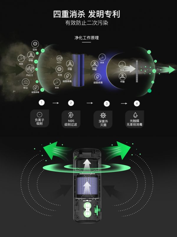 运用了此次发明专利的佳孚极光便携式空气净化器,具备四重净化功能。首先,持续散发的负离子能够有效吸附空气中的花粉、灰尘等粉尘颗粒物;当周围空气被吸进佳孚空气净化器后,通过N95级别滤网,可以过滤掉PM2.5等细小颗粒物;而后,机器内由紫外线灯及光触媒组成的闭环装置能够有效杀死残留的微型颗粒、甲醛、细菌病毒等有害物质。同时还配备了Air Cycle技术,可在机体内深度循环杀菌消毒,避免二次污染。经多个权威机构检测,在此发明专利加持下的佳孚极光便携式空气净化器在PM2.5洁净能力、甲醛洁净空气量、颗粒物洁净空气量、空气消毒试验等多个测试中的数据远远好于市场平均值。除了拥有强悍的杀菌净化功能外,佳孚极光便携式空气净化器还采用了新颖的轻巧设计,可满足如高铁、车内、卧室等多场景的使用。