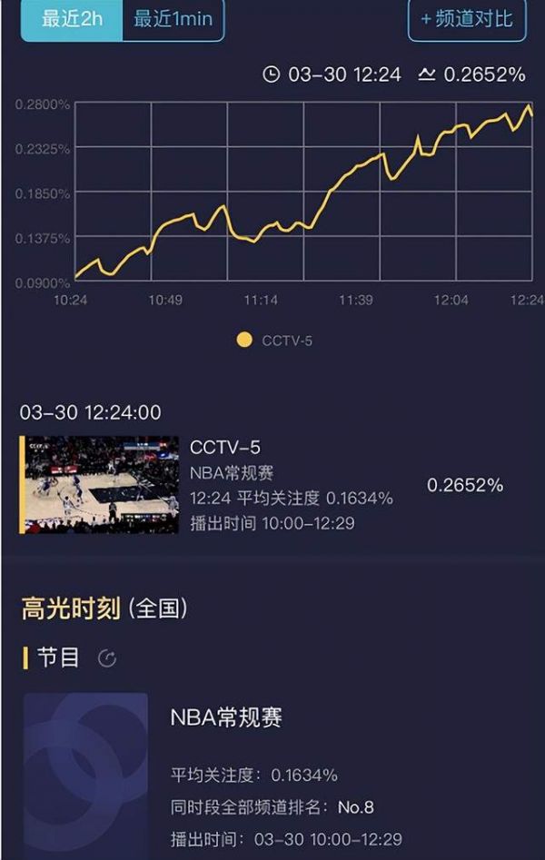 有数据表面,在比赛期间平均收视率为0.1634,最高时0.265,整体是往上走高的。说明不少人看到后还是会观看球赛~但联想到央视此前并未宣传复播,所以应该很多人不知道NBA重回CCTV-5了~