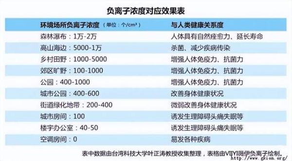 以下是由台湾科技大学叶正涛教授收集整理的负离子浓度调查表