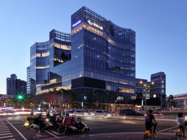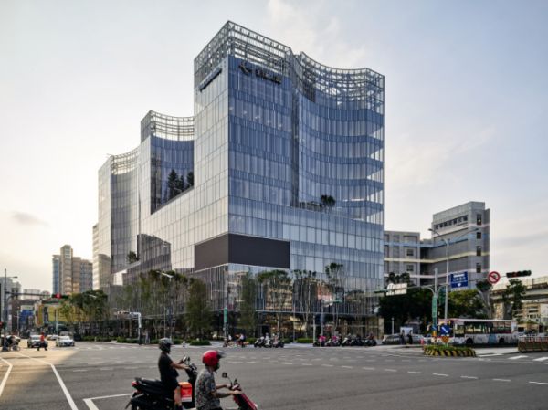 建筑立面运用了竖向条纹,代表了数位语言的”0”与”1”,白色的线条搭配轻巧的透明玻璃,白天,反射天空的蓝与建物深凹弧型的绿,融合週围也乎应最原始的发想,夜晚,藉由室内光条律动及光廊雨遮的圆形光斑,创造活泼但不失优雅的现代感,在不彰显量体的原则下,低调的白,融合特有的绿意氛围,使建筑物维持耐久及永续,却也不忘自身新的使命,也是设计者最真的初心。