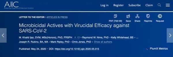 2020年5月24日发表在《美国感染控制杂志》(AJIC)上的《Microbicidal Actives with Virucidal Efficacy against SARS-CoV-2》(对SARS-CoV-2新冠病毒具有杀伤力的微生物杀灭试剂)文章介绍,通过研究发现,消毒活性物质:乙醇、对氯间二甲苯酚(PCMX)、水杨酸等,都能够实现对SARS-CoV-2新冠病毒的有效灭活。