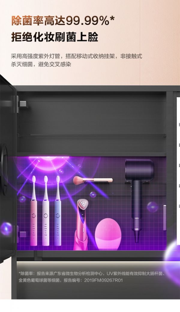 美的小仙境智能浴室镜柜是每一个追求美丽女孩子必备的神器,特别设置的健康杀菌仓采用高强度紫外灯管打造洁净收纳空间,搭配移动式收纳架,可以随心放置物品。非接触式的杀菌方式能有效避免交叉感染,除菌率高达99.99%,让使用者在上妆的时候不再把细菌刷上脸。可以说美的小仙境智能浴室镜柜满足了所有精致女孩对美妆用品除菌安全与高颜值的多重追求,解决了消杀与收纳等问题和痛点。