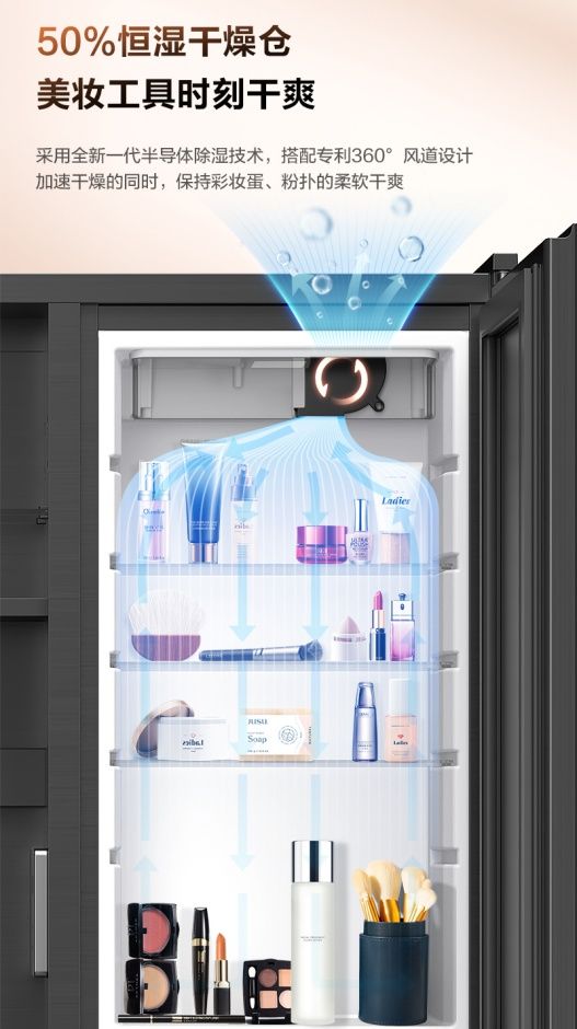 美的小仙境智能浴室镜柜犹如护肤用品“小管家”,其50%恒湿干燥仓能专业呵护每一瓶化妆品、护肤品,全新一代半导体除湿技术加持专利360°风道设计,让内部空气保持干净清爽的状态,营造适合护肤品存放的湿度环境。平时护肤将精华和安瓶放在这里,再也不担心会氧化变质的问题,粉扑也都是柔软干爽的质感。用专业恒湿干燥仓换取更自在的生活方式,悦享每日护肤时刻带来的魅力与快乐。