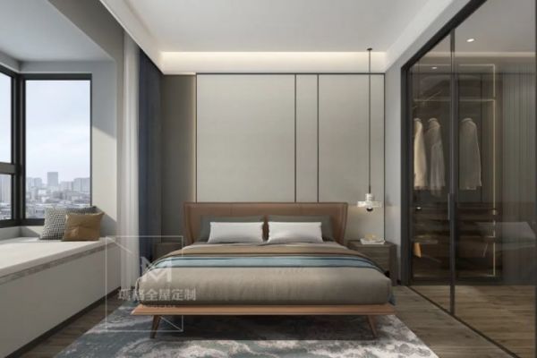 主卧主色调为充满高级感的暖浅灰色,饰以清雅的深蓝色块,打破空间的沉闷。木质地板、床头柜为卧室注入古朴自然的气息。宽大的玻璃飘窗为室内带来充盈的阳光。