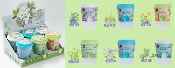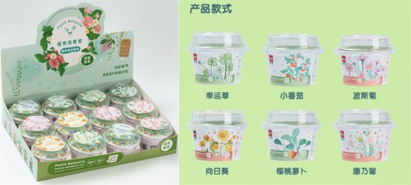 74387植物栽培套装采用的是精美展示盒包装,有幸运草、小番茄、波斯菊、向日葵、樱桃萝卜、康乃馨6种植物可选,共12杯装。杯型精致小巧,迷你可爱,好似“掌上植物园”,可作为低龄儿童或是初次体验者的入门之选。