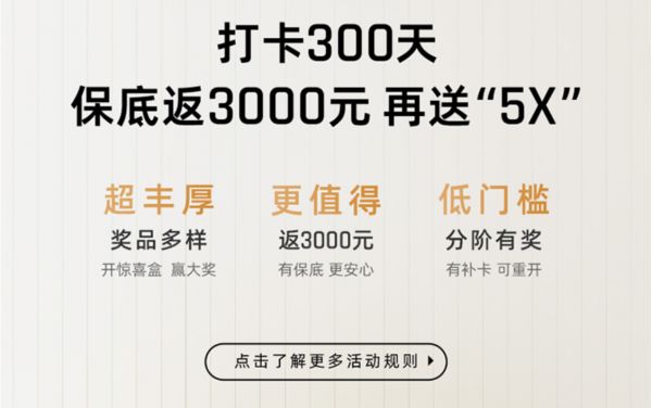 打卡300天:惊喜盒必得奖励为3000元购物卡,随机奖励(可得其中1种)包括联想拯救者笔记本电脑1台、奇遇会员季卡1张、奇遇会员半年卡1张、奇遇商店游戏2款、奇遇商店游戏3款、奇遇定制玩偶公仔1个。