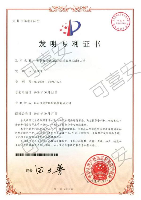 可喜安保健石发明专利说明:本发明(可喜安保健石)可释放对人体有保健作用的远红外线及负离子,同时具有吸收和屏蔽有害电磁波的作用。