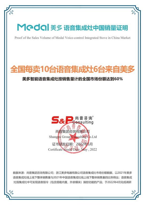 近日,一份来自尚普咨询的证明报告显示,“全国每卖10台语音集成灶6台来自美多”——美多智能语音集成灶按销售量占全国市场份额60%。
