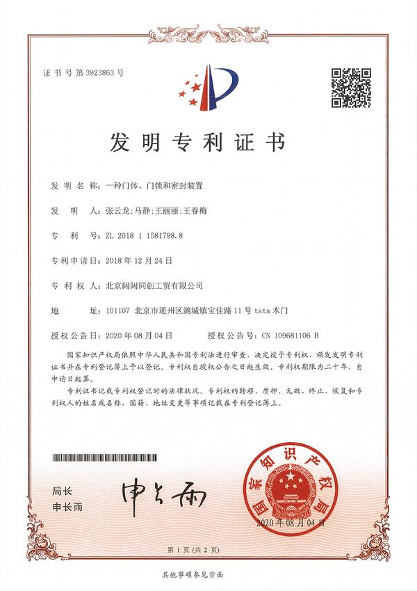 在产品研发上,TATA木门行业首创45度斜口专利技术。2012年TATA木门首次新品发布会,成功研发45°斜口磁吸降噪门,荣获国家外观设计专利(ZL 2012 3 0391523.5)、“一种门及其密封装置”实用新型专利(专利号:ZL 2015 2 0344001.8)等多项国家专利,让更多人拥有安静的品质生活。